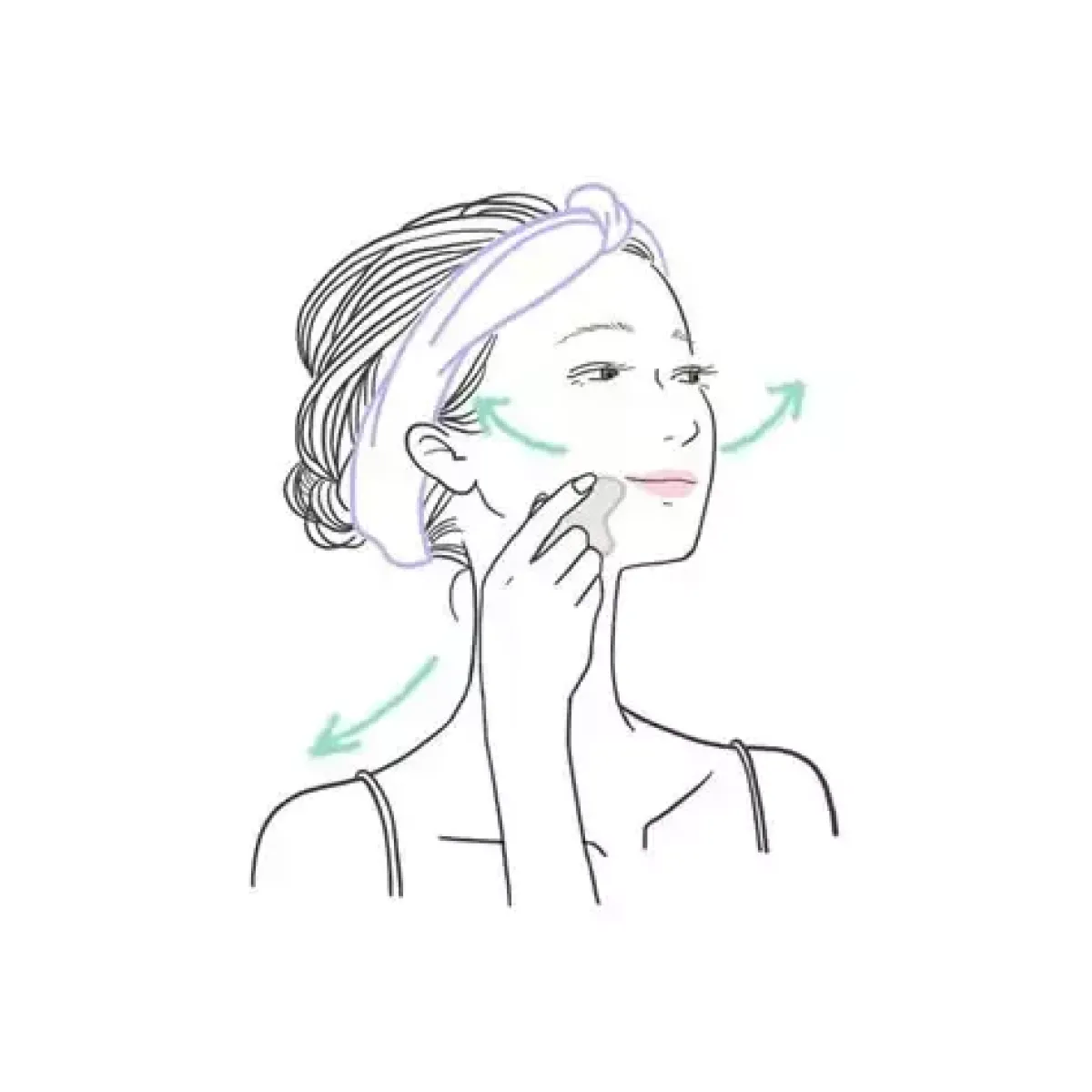 Працювати плиткою у напрямку масажних ліній: від центру чола до скронь, від крил носа до скронь, від кінчика носа до центру чола, від куточків рота до скронь, від центру підборіддя до мочок вух.