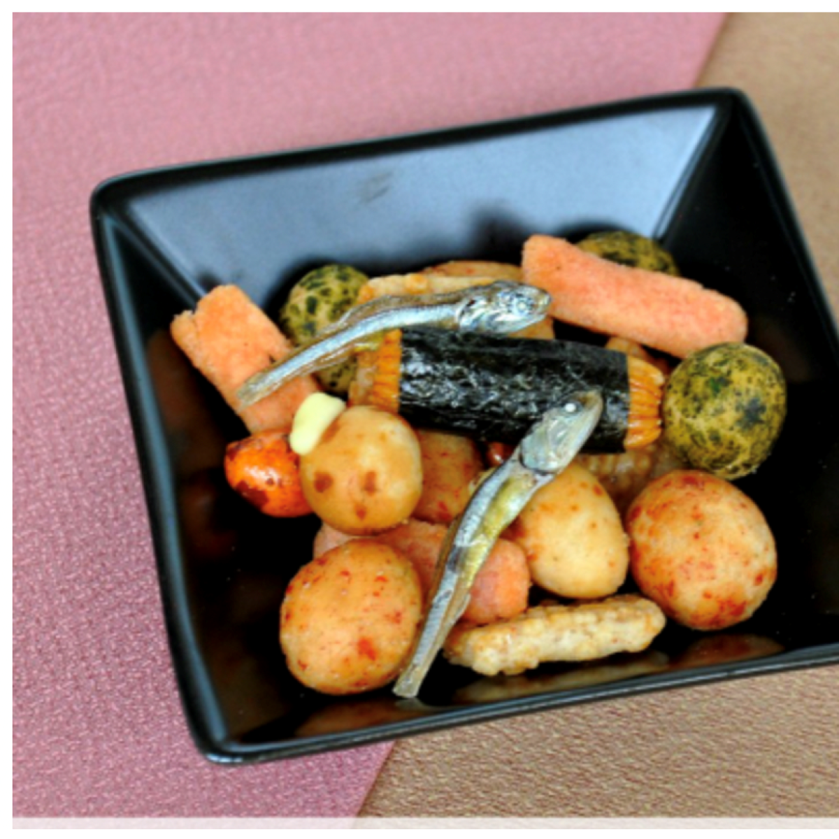 Peanuts (imported), wheat flour, rice, starch, sugar, vegetable oil, sardines, kombu powder, glutinous rice, mustard mayonnaise seasoning, soy sauce, salt, shrimp, dextrin, seaweed, shrimp extract, squid, starch syrup, spices, oyster sauce, flavoring seasonings, protein hydrolysate / processed starch, leavening agent, trehalose, seasoning (amino acids, etc.), flavoring, coloring (red yeast rice, carotenoid, caramel), emulsifier, acidifier, thickener (pullulan), spice extract.