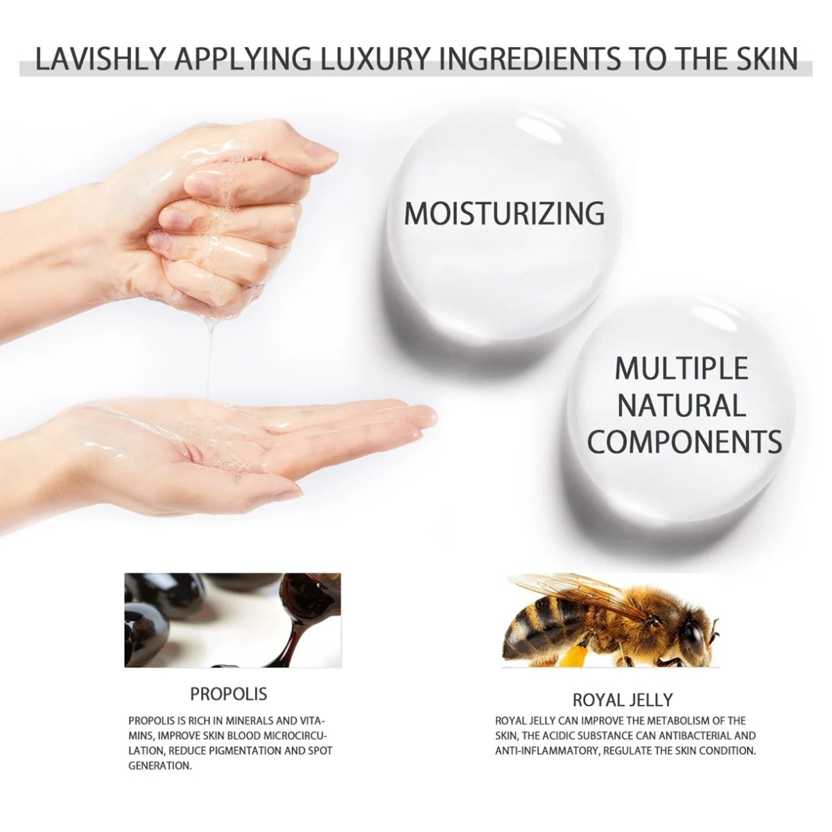 Water, glycerin, BG, DPG, phenoxyethanol, chlorphenesin, allantoin, carbomer, panthenol, PEG-60 hydrogenated castor oil, TEA, fragrance, royal jelly extract, propolis extract, EDTA-2Na, boswellia serrata resin extract, aloe vera leaf extract, sodium hyaluronate, polyacrylic acid sodium.