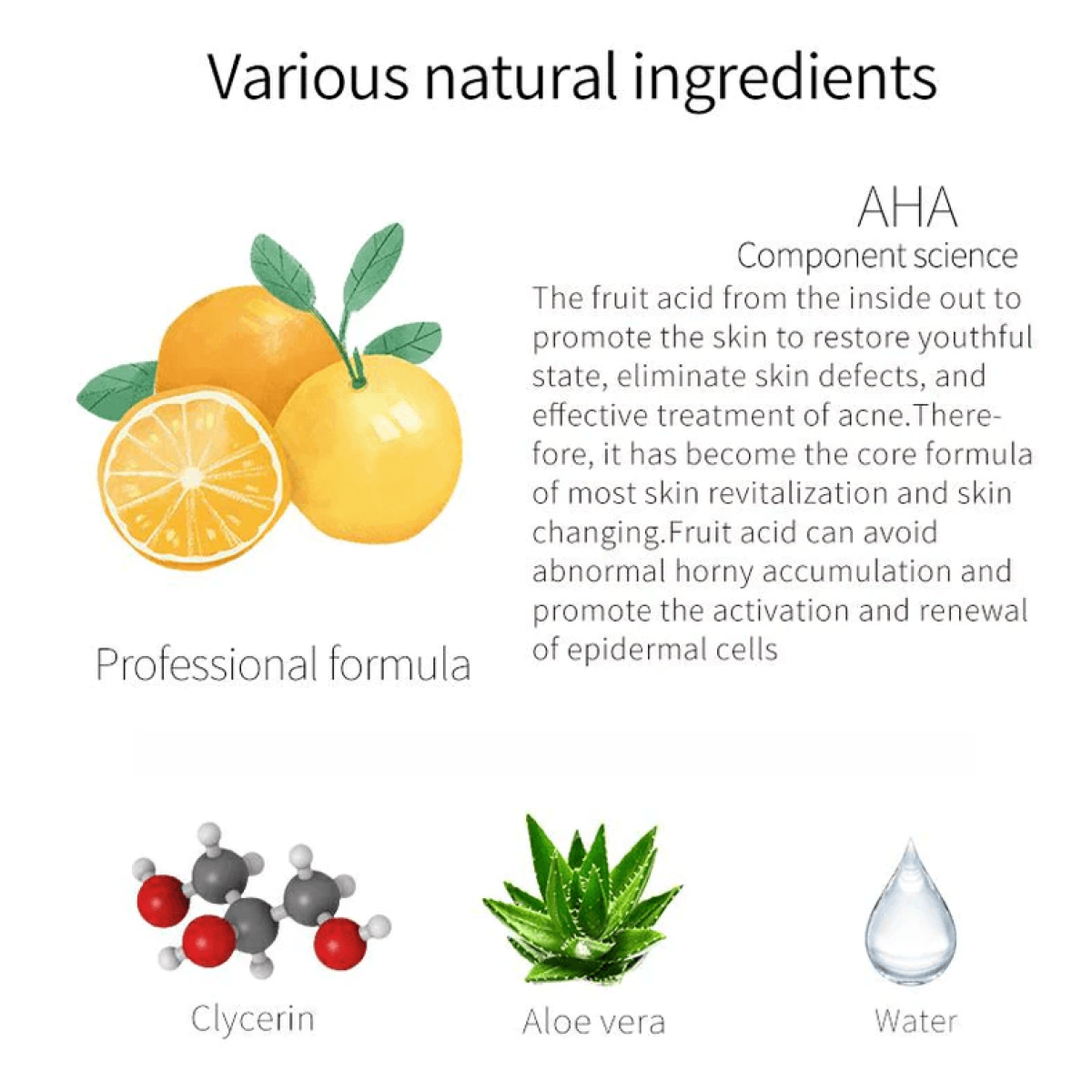 Основні компоненти у складі маски — AHA-кислоти — мають відлущувальний ефект, затримують вологу у шкірі, стимулюють синтез колагену та еластину, забезпечують протизапальну дію та допомагають у боротьбі зі зморшками та гіперпігментацією.