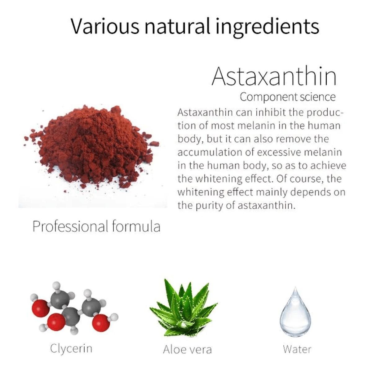 Основний компонент у складі маски — астаксантин — є потужним антиоксидантом, який захищає шкіру від дії вільних радикалів — молекул, які руйнують природний колаген, провокуючи передчасне старіння. Компонент здатен підвищувати еластичність шкіри, захищає її від негативного впливу ультрафіолетового випромінювання та сприяє збереженню вологи всередині шкіри.