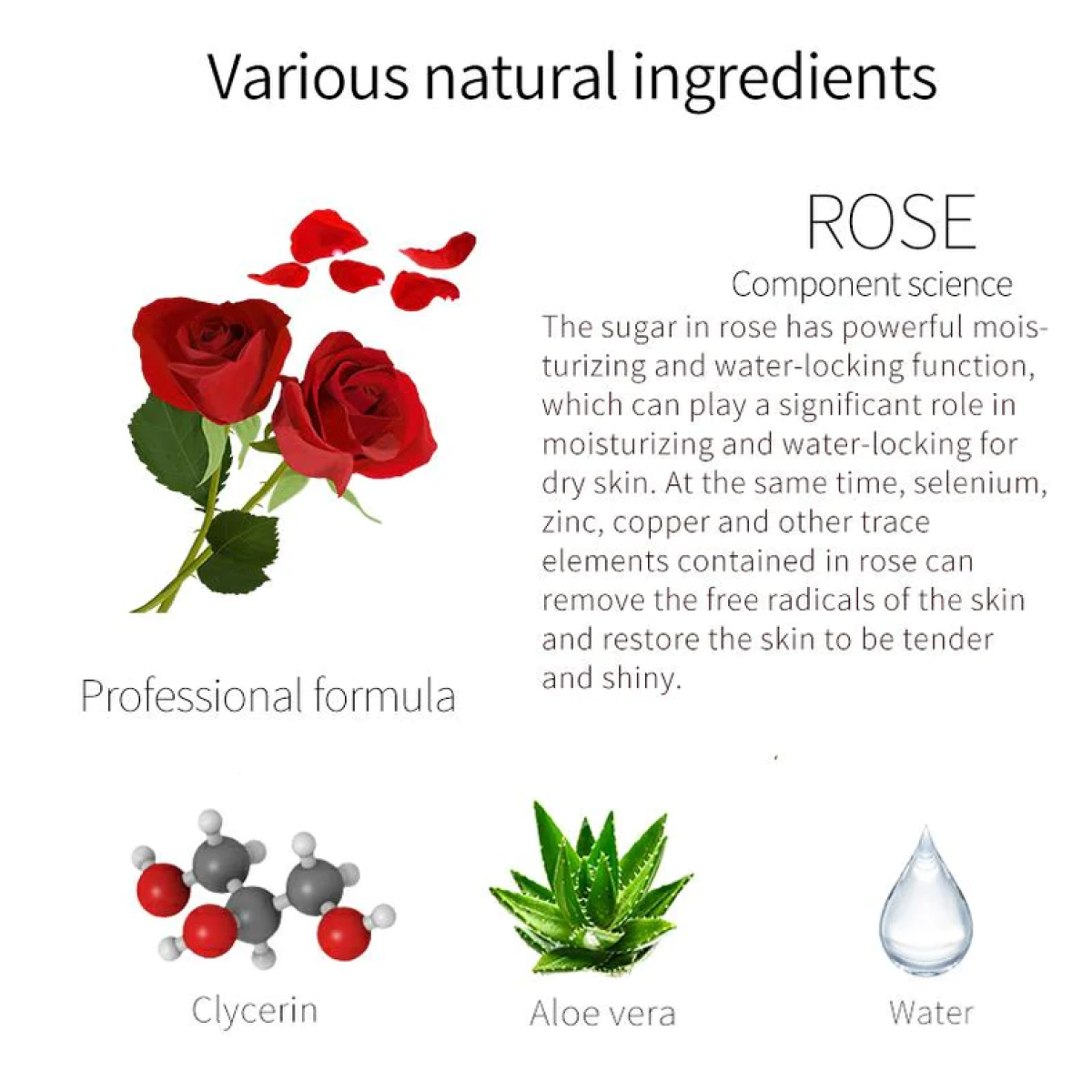 Aqua, glycerin, butylene glycol, dipropylene glycol, phenoxyethanol, chlorphenesin, allantoin, carbomer, panthenol, PEG-60 hydrogenated castor oil, triethanolamine, rose extract, disodium EDTA, aloe barbadensis leaf extract, boswellia serrata gum extract, fragrance, sodium hyaluronate, sodium polyacrylate.