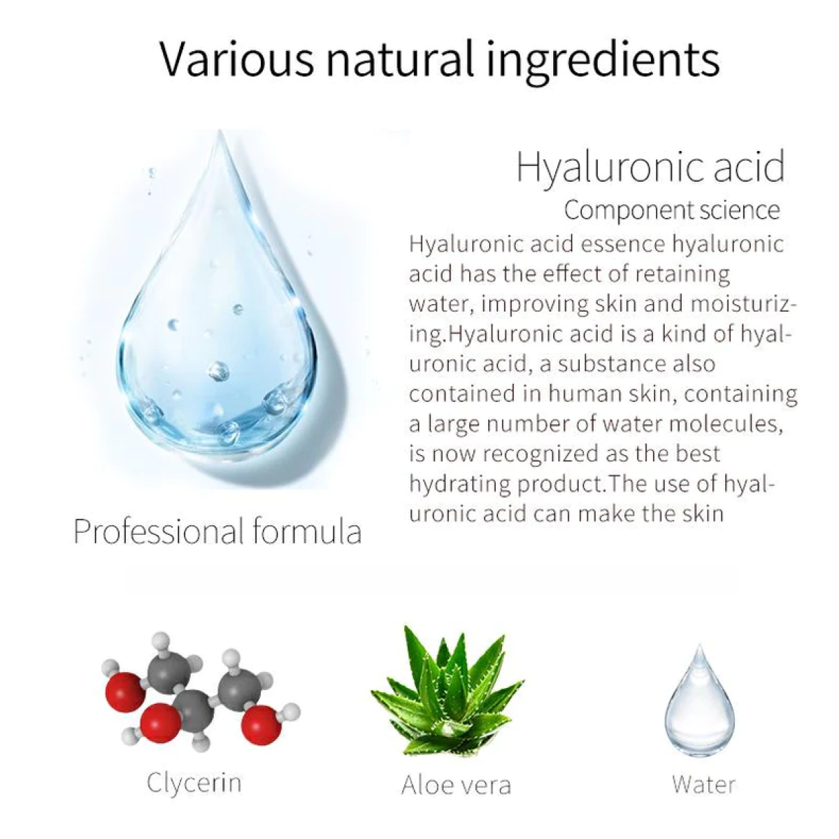 Гіалуронат натрію — один зі структурних елементів низькомолекулярної гіалуронової кислоти, який гарантує активне зволоження шкірних покривів зсередини та сприяє розгладженню зморщок і рубців на шкірі.