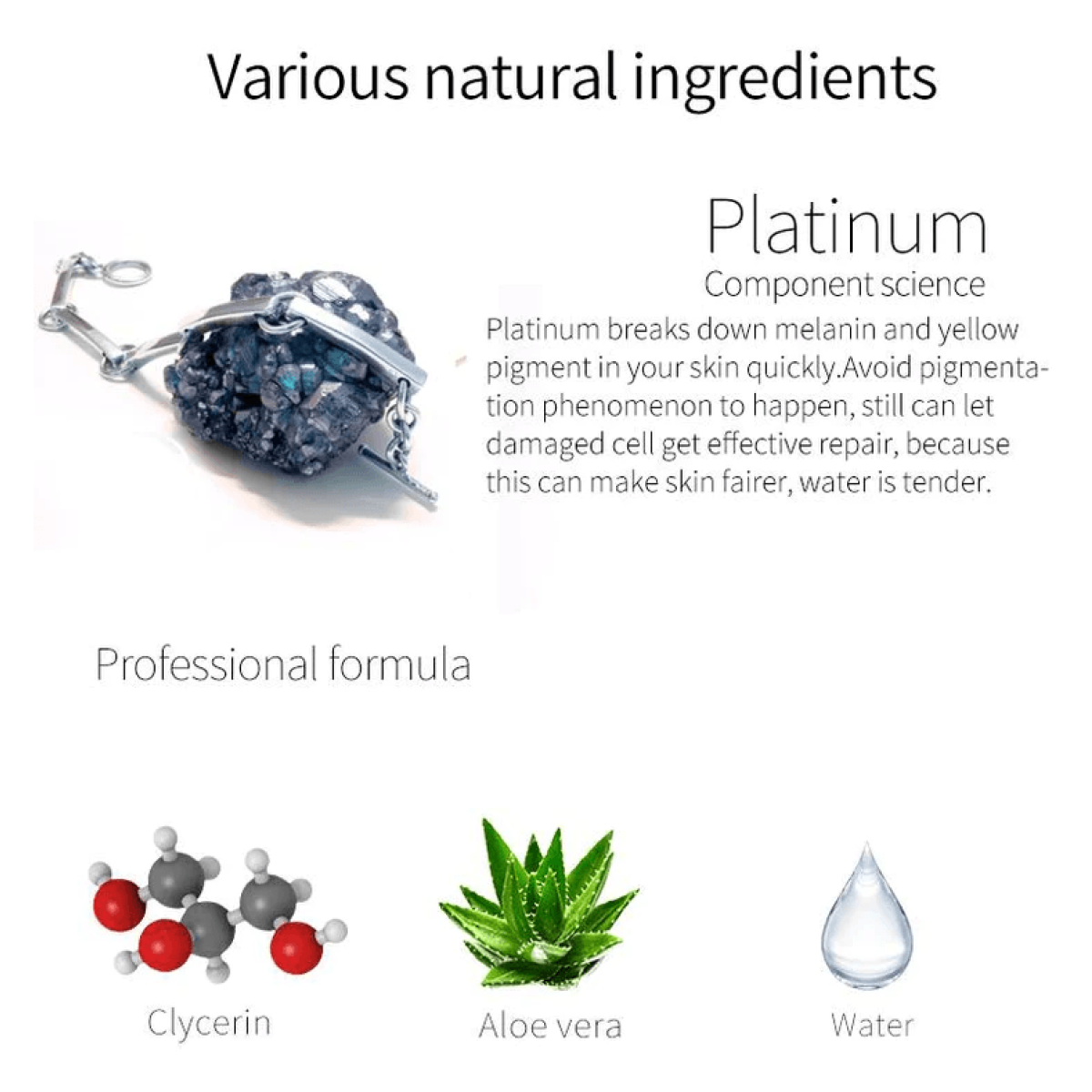 Основний компонент у складі маски — колоїдна платина — сприяє зменшенню зморшок, нейтралізує вільні радикали, які провокують старіння шкіри, має сильний очисний ефект і антибактеріальні властивості.