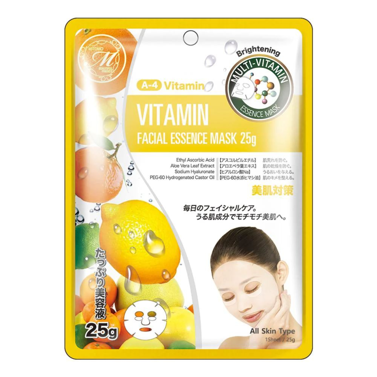 Тканинна маска від бренду MITOMO забезпечує активне живлення шкіри вітамінами та іншими цінними компонентами, розгладжує шкіру, глибоко зволожує та покращує її вигляд, допомагає у боротьбі із запаленнями та надмірною пігментацією.