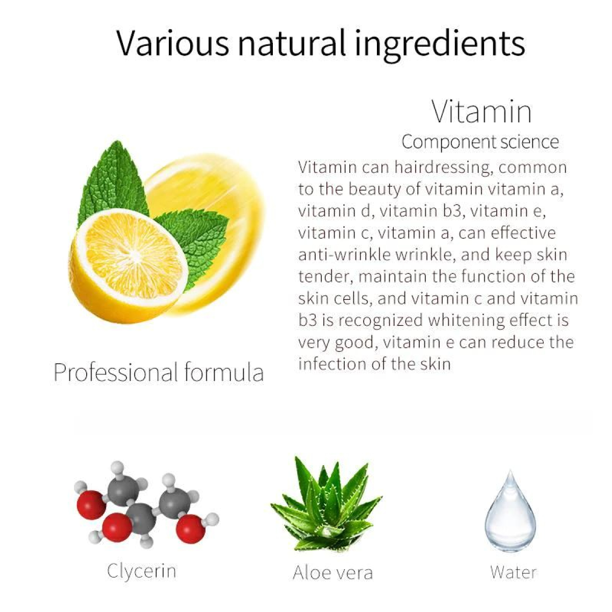 Основні компоненти у складі маски — вітаміни — мають потужну антивікову дію, допомагають у боротьбі зі зморшками та запобігають їх появі, вирівнюють тон обличчя, усувають надмірну пігментацію шкіри, мають протизапальні та антибактеріальні властивості.