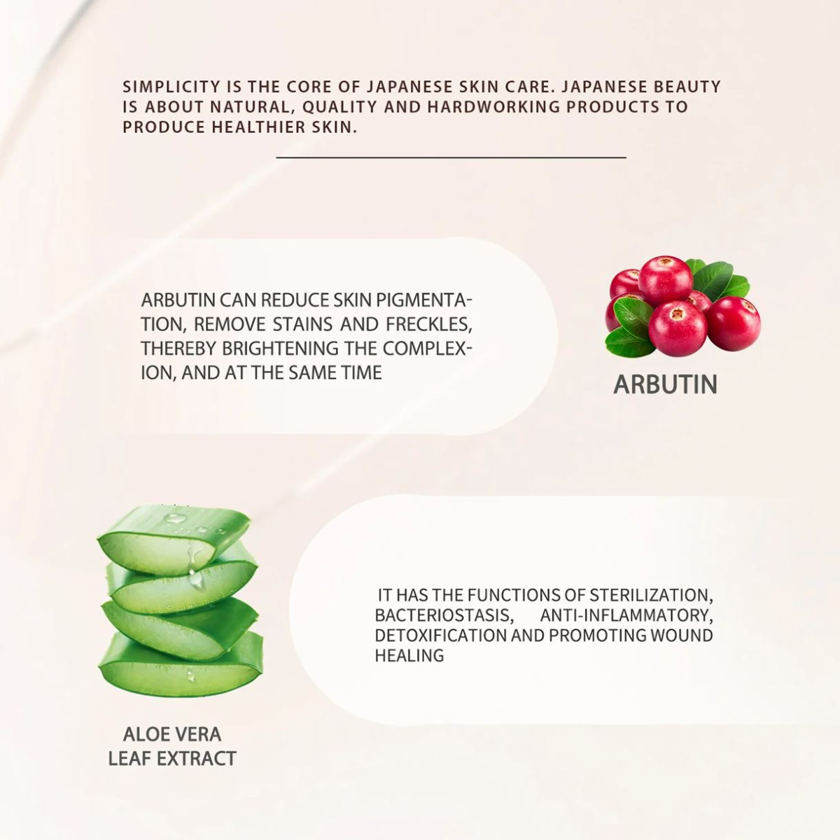 Арбутин сприяє зменшенню надмірної пігментації шкіри, допомагає у боротьбі з пігментними плямами та ластовинням, вирівнює тон обличчя, підтримує оптимальний рівень зволоженості та еластичність шкіри, а також зміцнює її та прискорює процеси регенерації.
