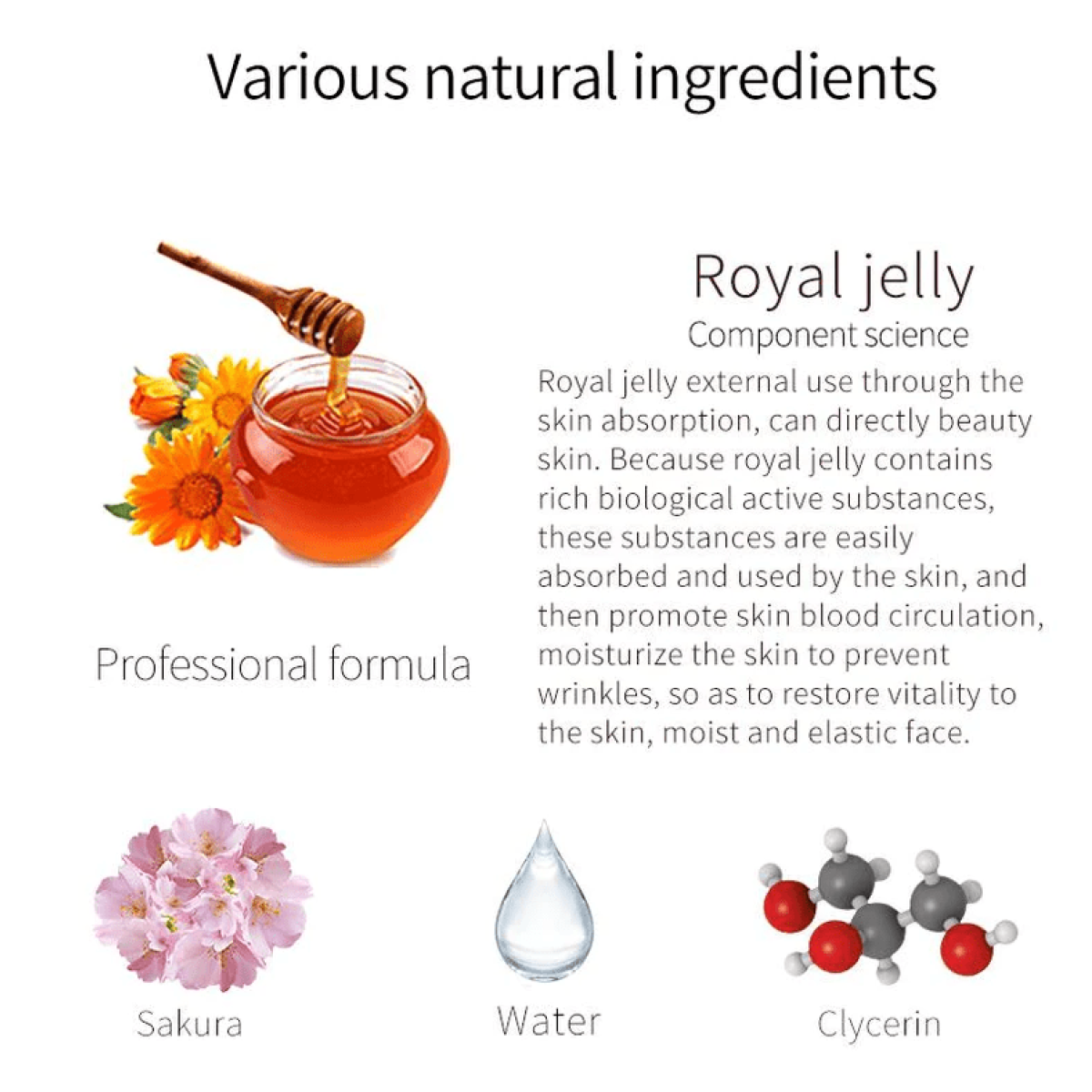 Aqua, glycerin, butylene glycol, dipropylene glycol, phenoxyethanol, chlorphenesin, allantoin, carbomer, panthenol, PEG-60 hydrogenated castor oil, triethanolamine, prunus serrulata flower extract, royal jelly extract, disodium EDTA, aloe barbadensis leaf extract, boswellia serrata gum extract, fragrance, sodium hyaluronate, sodium polyacrylate.