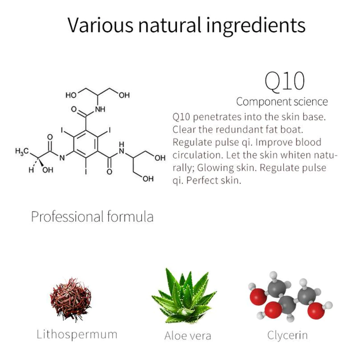 Aqua, glycerin, butylene glycol, dipropylene glycol, sodium hyaluronate, carbomer, lithospermum officinale root extract, aloe barbadensis leaf extract, boswellia serrata extract, potassium hydroxide, caprylyl glycol caprylhydroxamic acid, disodium EDTA, chlorphenesin, allantoin, panthenol, PEG-60 hydrogenated castor oil, ubiquninone, fragrance.