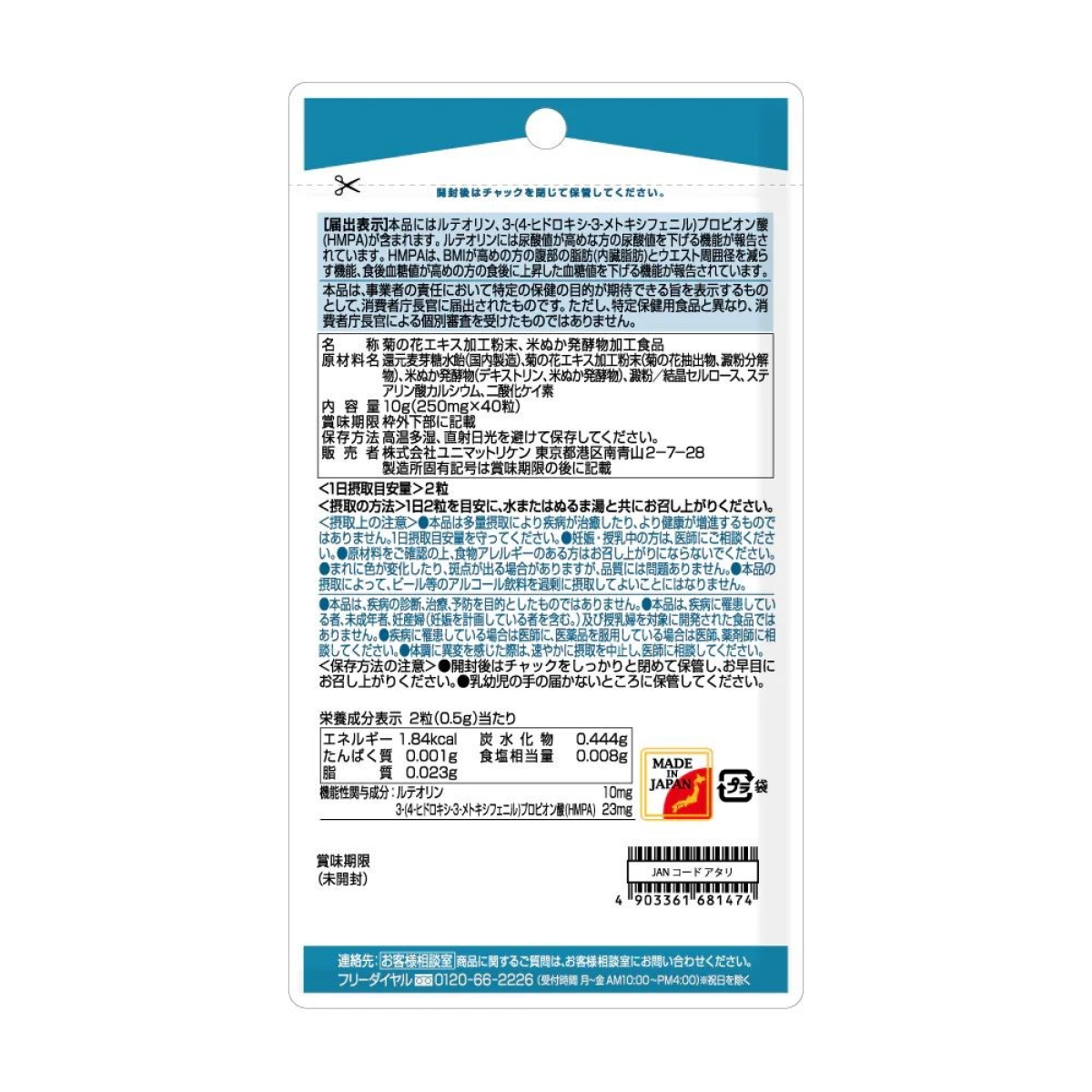 Reduced maltose starch syrup (manufactured in Japan), processed chrysanthemum flower extract powder (chrysanthemum flower extract, starch decomposition product), fermented rice bran product (dextrin, fermented rice bran product), starch/crystalline cellulose, calcium stearate, silicon dioxide.